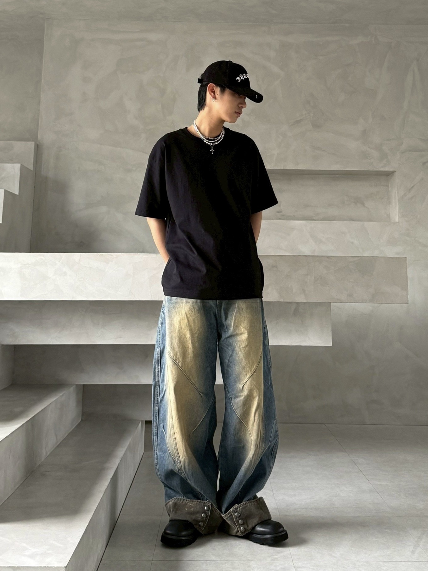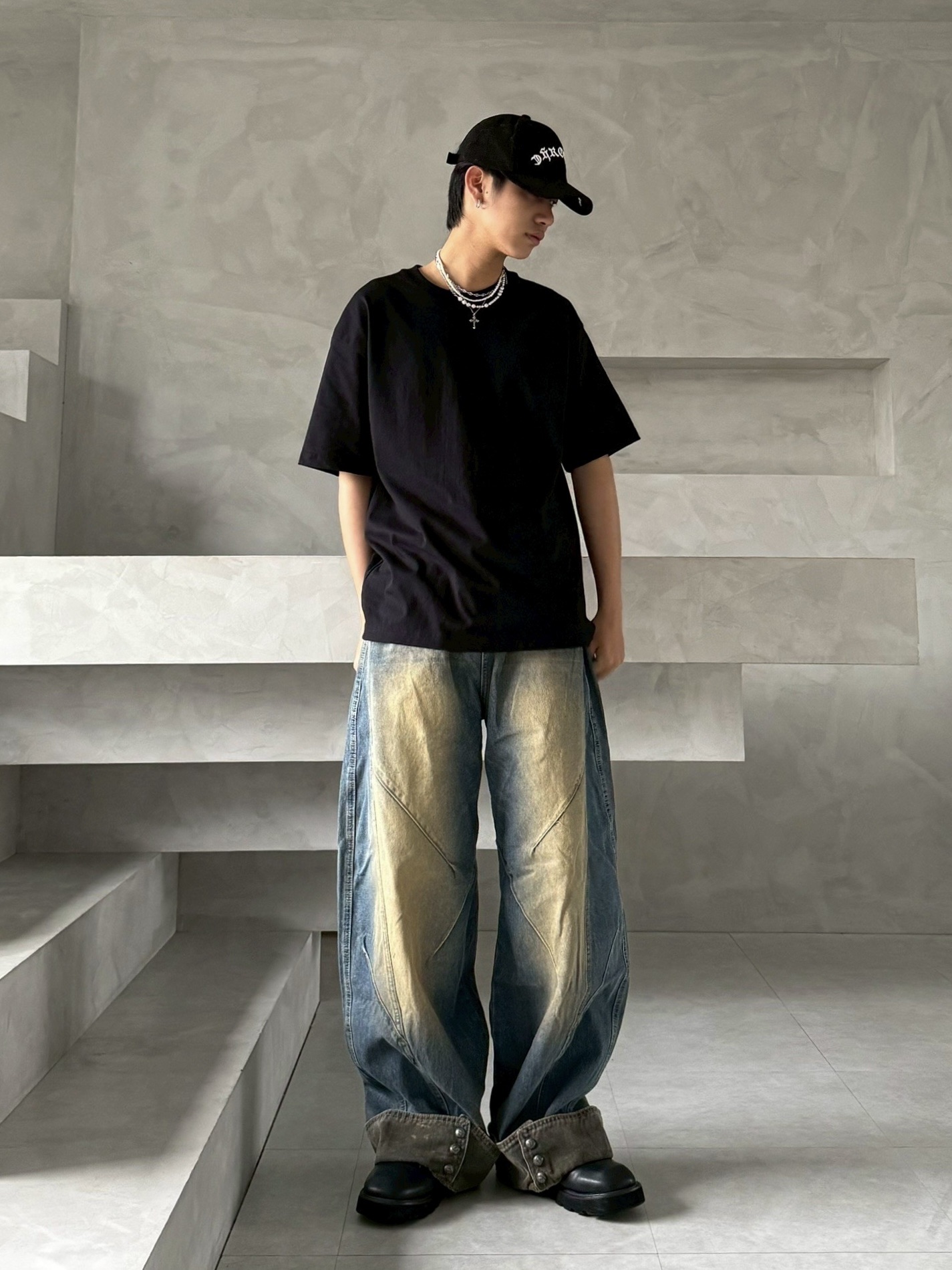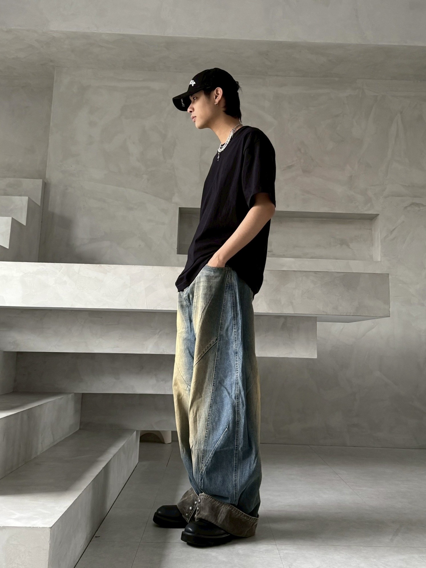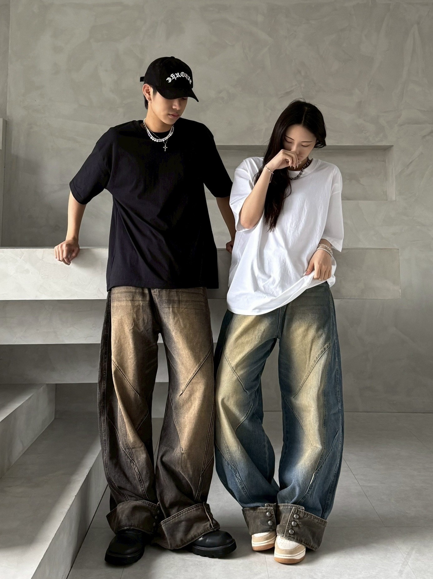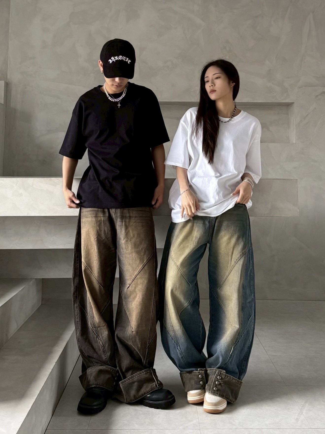 韓國 汙泥 交錯 拼接 裁片 褲管反折 復古 水洗 寬褲 牛仔褲 (2color)