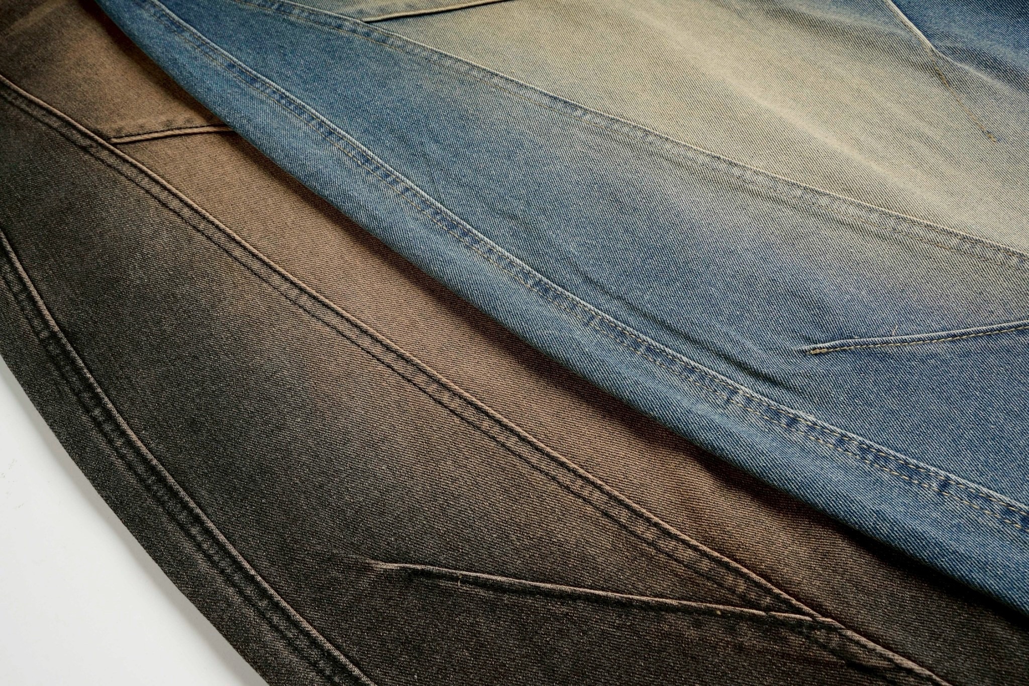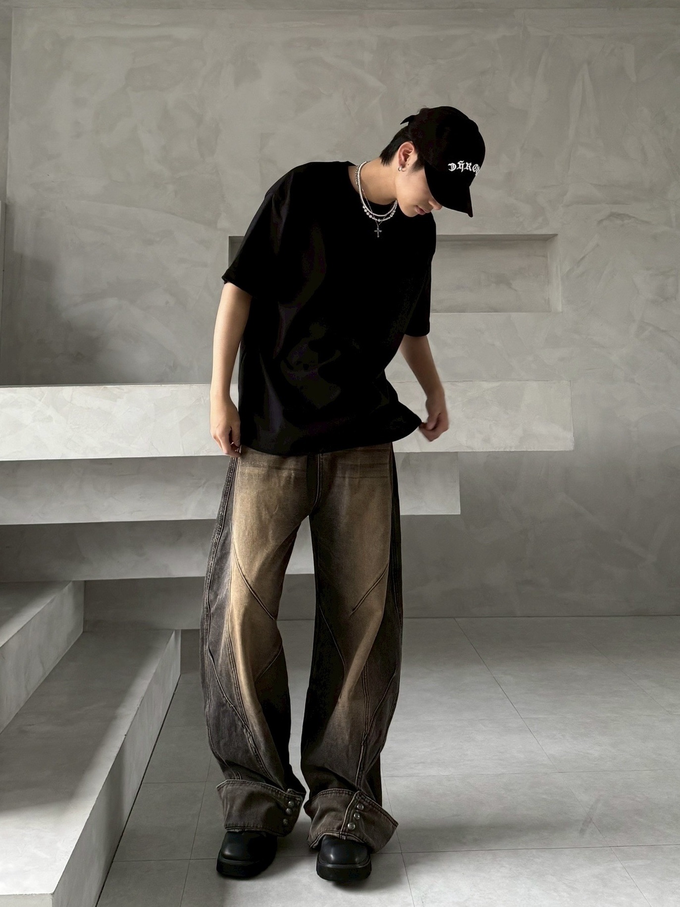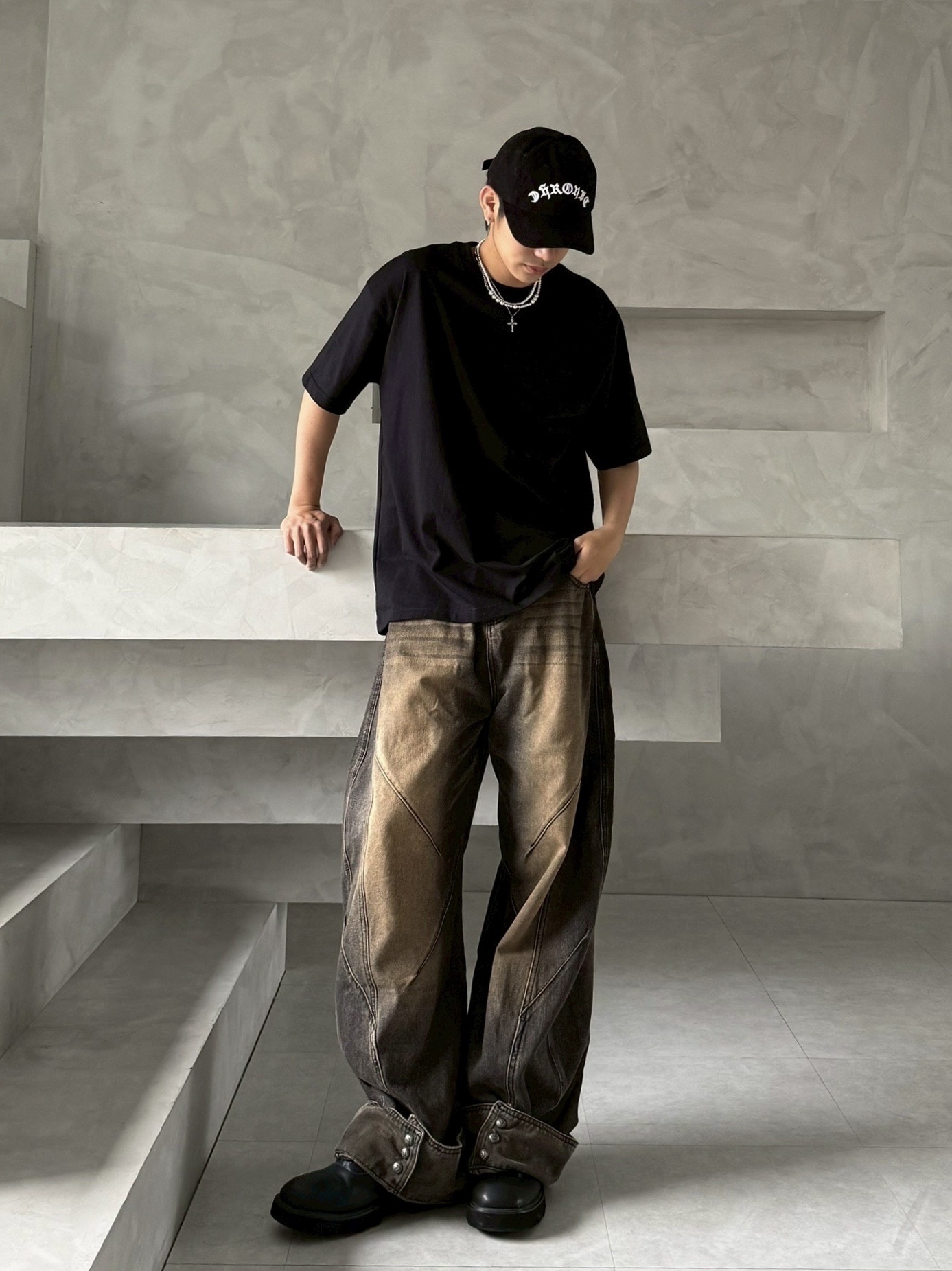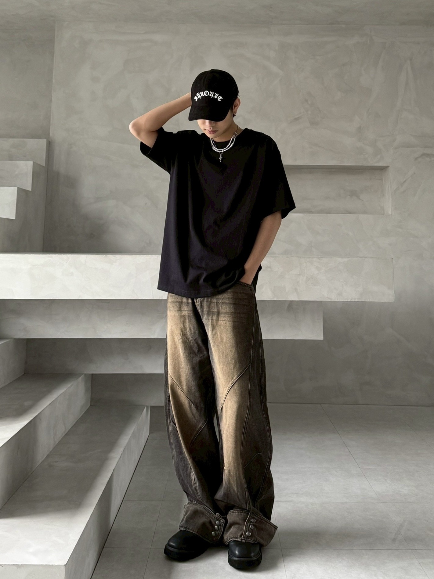 韓國 汙泥 交錯 拼接 裁片 褲管反折 復古 水洗 寬褲 牛仔褲 (2color)