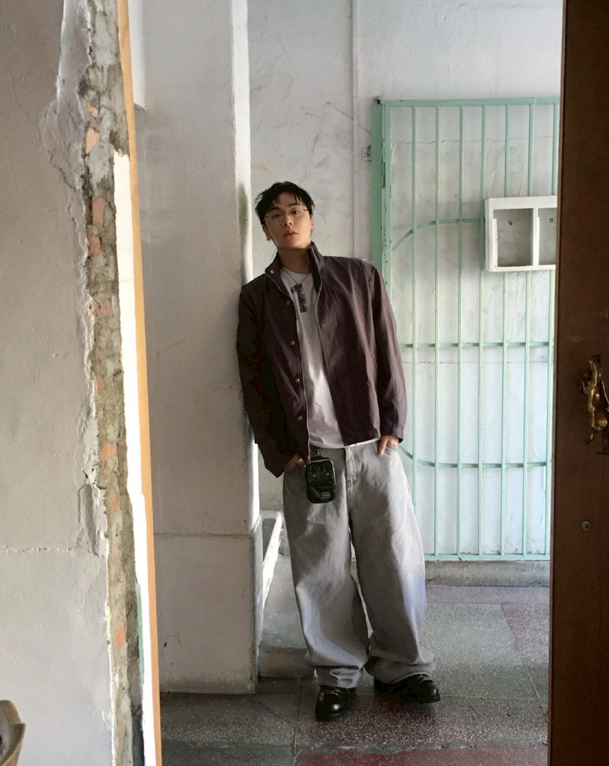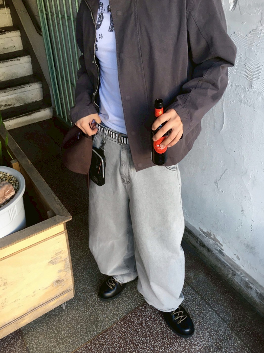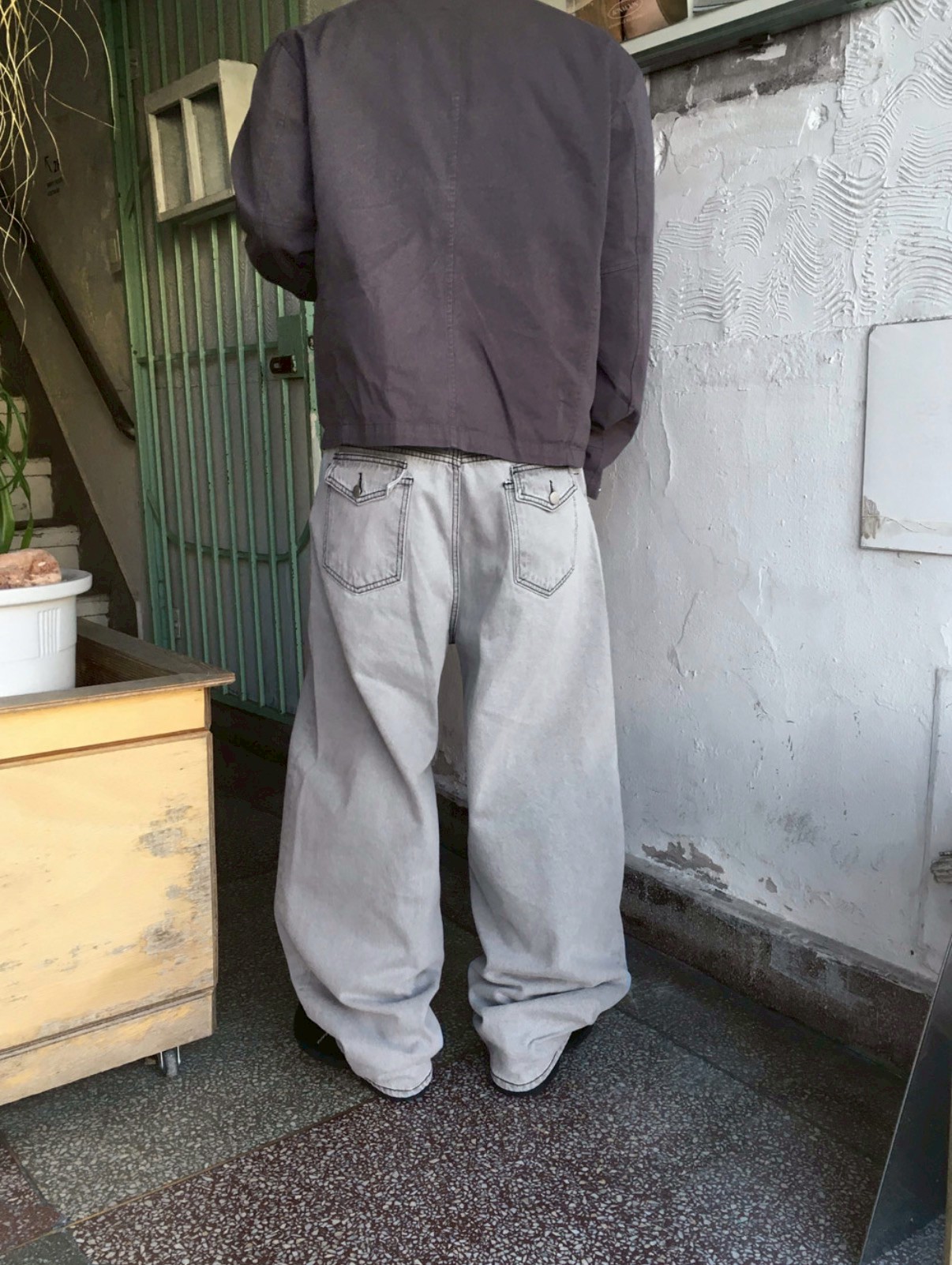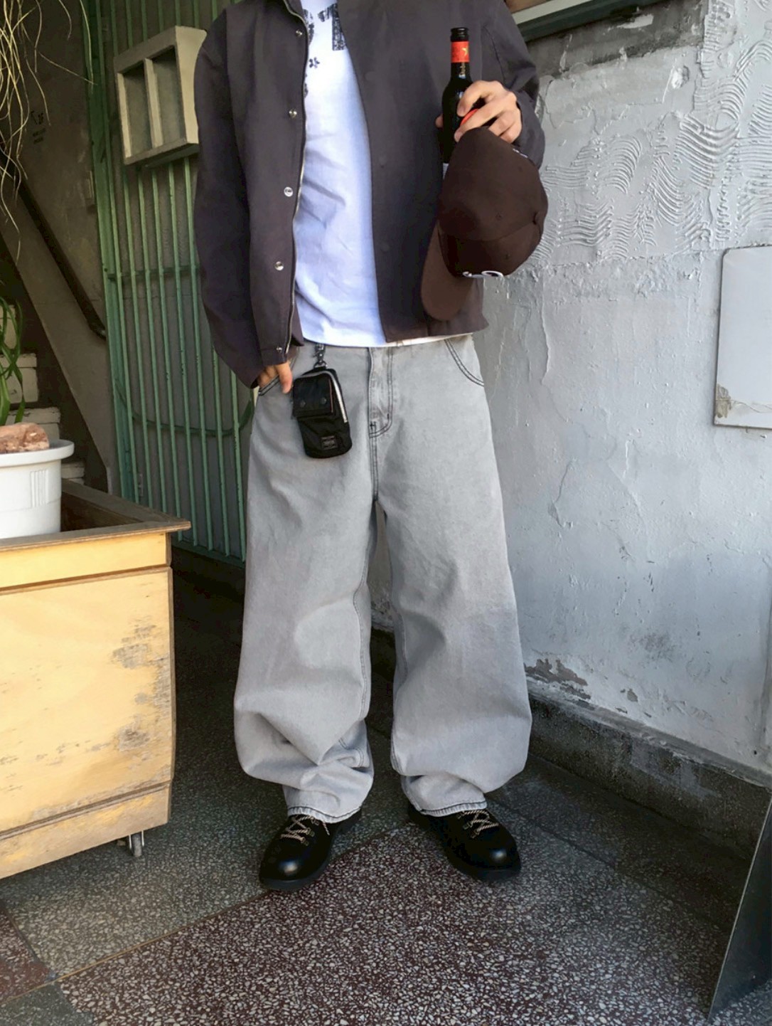 HOLY IN CODE 高級感 煙灰 水洗 素色 寬褲 牛仔褲 長褲